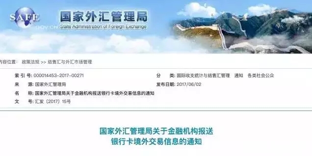 6月2日,外管局官方網(wǎng)站發(fā)布了《國家外匯管理局關于金融機構報送銀行卡境外交易信息的通知》,通知寫道,為加強銀行卡境外交易監(jiān)測管理,維護銀行卡境外交易秩序,外管局決定開展銀行卡境外交易信息采集工作,自2017年9月1日起施行。